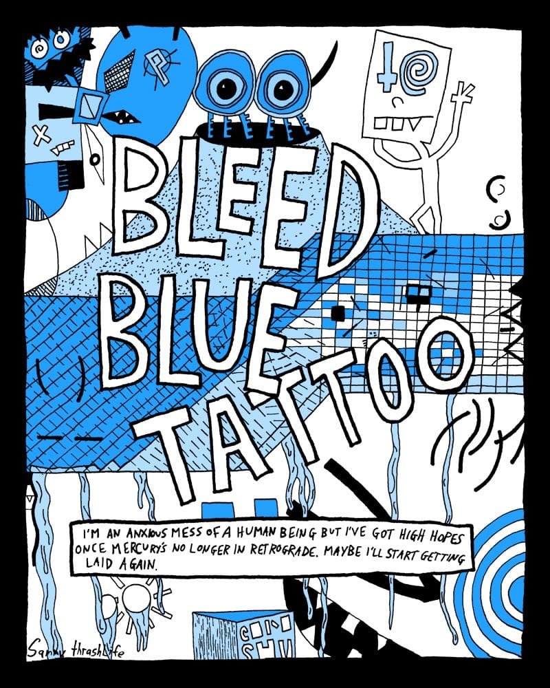 With all the tattooing I’ve been doing myself lately, it kind of makes sense that I’d do some work for an actual tattoo shop. (Or maybe not?) In any case, this commission came in two nights before my own tattoo career started. On my way to Minneapolis for Cleveland Bound Death Sentence, I stopped in Lexington. My buddy, Chris, works for Bleed Blue Tattoo and, while we were there, I met the shop’s owner, Tommy. Being the self-promoting little fuckshit that I am, I (of course!) told him about my artwork. He was cool enough to commission me to design a shirt for Bleed Blue right then and there. He was also cool enough to tell me I could do whatever I wanted – so I did, right down to the sort of overly-personal text that I put in virtually all of my pieces. The only real guideline I gave myself was a limited color palette since I knew that – when it comes to silkscreens – more colors means higher printing costs.
