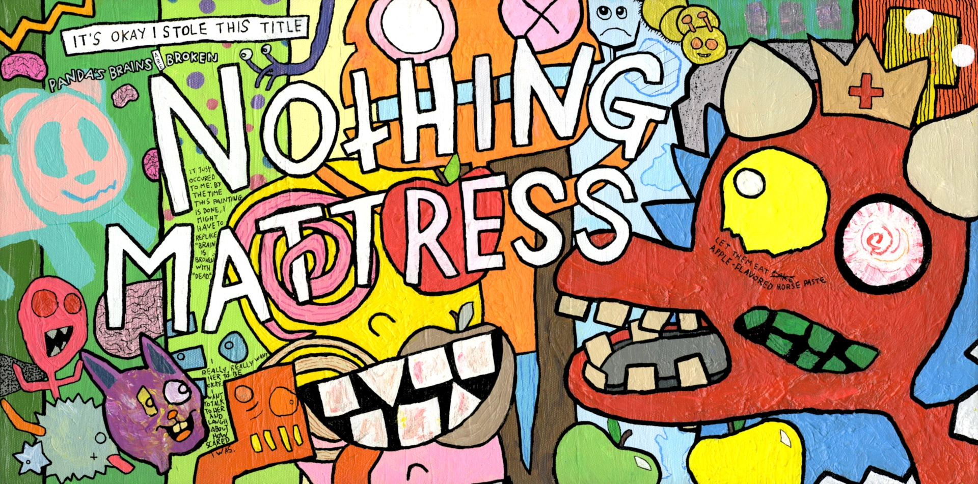 When I got back to the painting, in between “it’s okay I stole this title” and “NOTHING MATTRESS,” I wrote “Panda’s brains are broken.” But then: