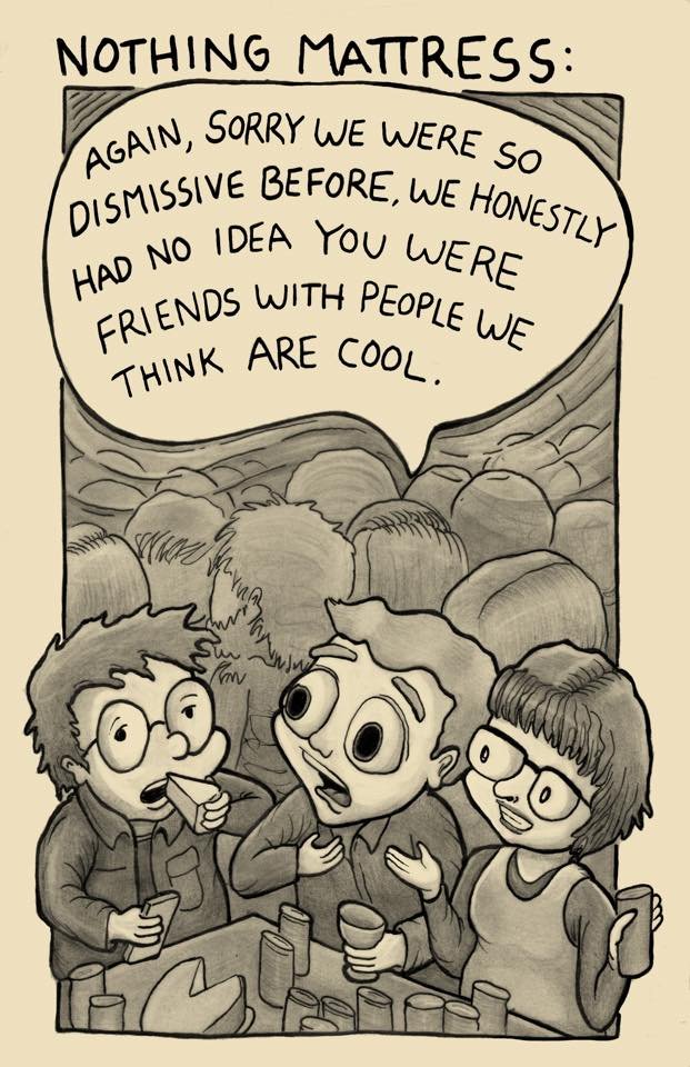 AS NOTED, I stole this title. “Nothing Mattress” was a really cool comic and zine by Brian Connolly. When I found out other people were stealing “nothing mattress” (knowingly or otherwise) for other projects, I decided it was fair game. Especially since (1) NOTHING MATTERS and (2) I could use this statement as a corrective to let the world know that – regardless of where you first saw it – CREDIT GOES TO BRIAN. Or at least I think it does. I don’t know him but he was certainly the first to publicize the phrase at all. Either way, you should check out NOTHING MATTRESS by Brian Connolly.