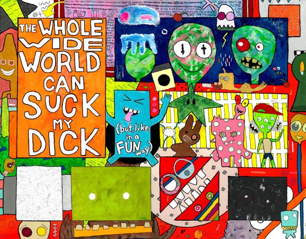 This painting’s not about about going away for 5 weeks. Its title (LIKE ALL GOOD TITLES) is a suicide threat. I’m not even 5% of the way to that BUT I STILL ENJOY THE SENTIMENT. And I finished painting it 8 weeks before this all happened, but it’s felt like it’s missing something — and that something is definitely some petty/diaper-baby text. So I’m gonna hit it with a pen and work most of this in there. “BIRTHDAY PUMPKIN IS FUCKING DONE FOREVER” strikes me as especially funny. [I’m such a substantive, serious person!]