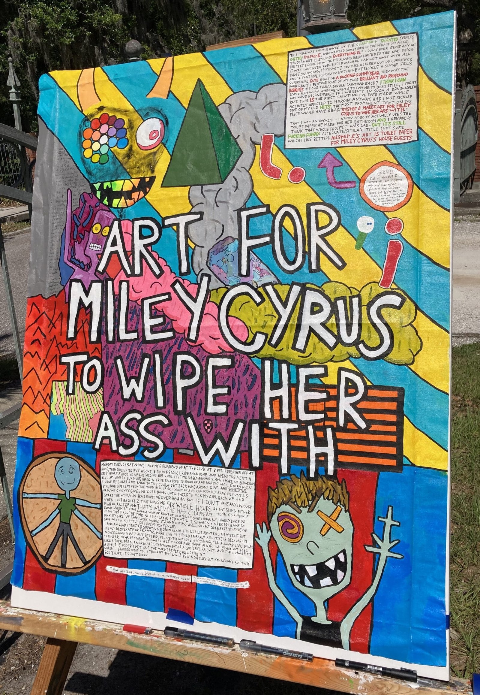 This was the only painting I think I ever started and worked on while I was actively using drugs. It was started (and mostly painted) in 2018 when a friend (who is also an artist, and who was commissioned to make art for Miley Cyrus, including CUSTOM TOILET PAPER) commissioned a piece *from me*. Because I was on drugs though, I didn’t actually finish it until SIX YEARS LATER, in April of 2024. Unfortunately, I wasn’t able to get a professional photograph of it before I shipped it off to its owner. He’d already WAITED LONG ENOUGH.