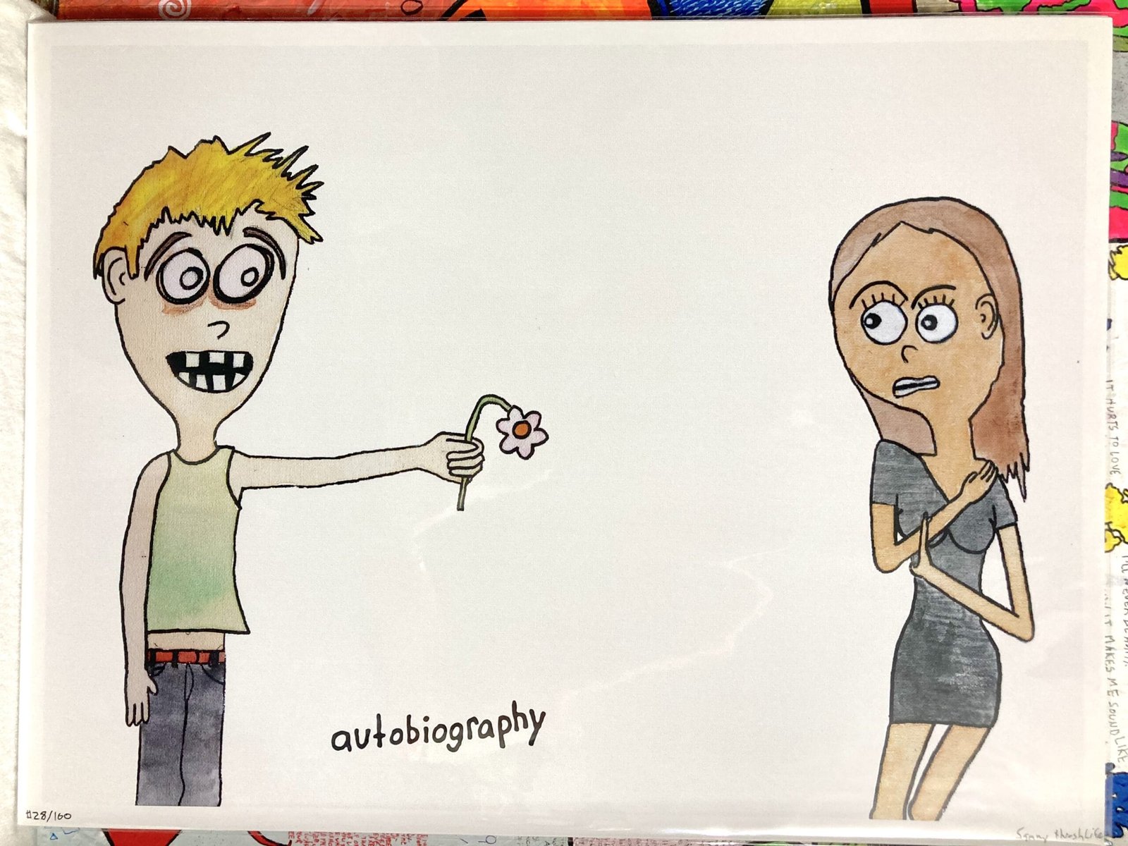 Bright colors, rotten smiles, and mischievous titles in bold block letters jump off the canvas, but it’s the hidden details and intensely personal small-print journals that sink their hooks in.