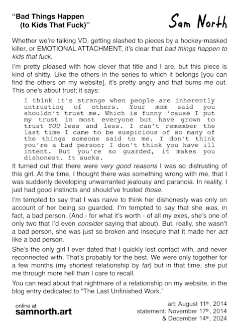 “Bad Things Happen (to Kids That Fuck)” was drawn by artist Sammy thrashLife in August 2014 in Chicago. The story behind it is featured on samnorth.art.