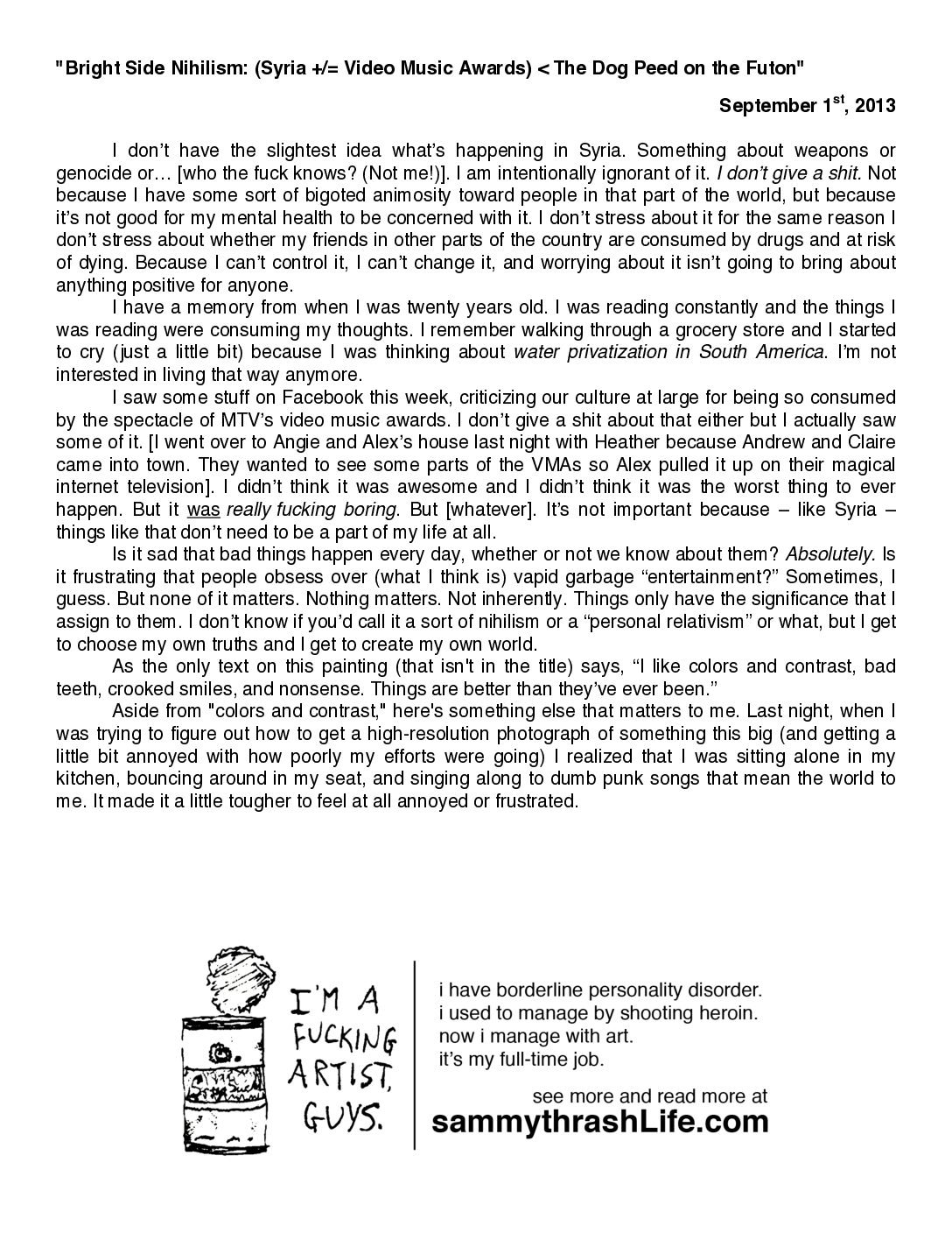 “Bright Side Nihilism: (Syria +/= Video Music Awards) < The Dog Peed on the Futon” is a 3×4-foot acrylic painting, created by artist Sam North in Jacksonville, FL in September 2013. The full story behind it is featured right here on samnorth.art.