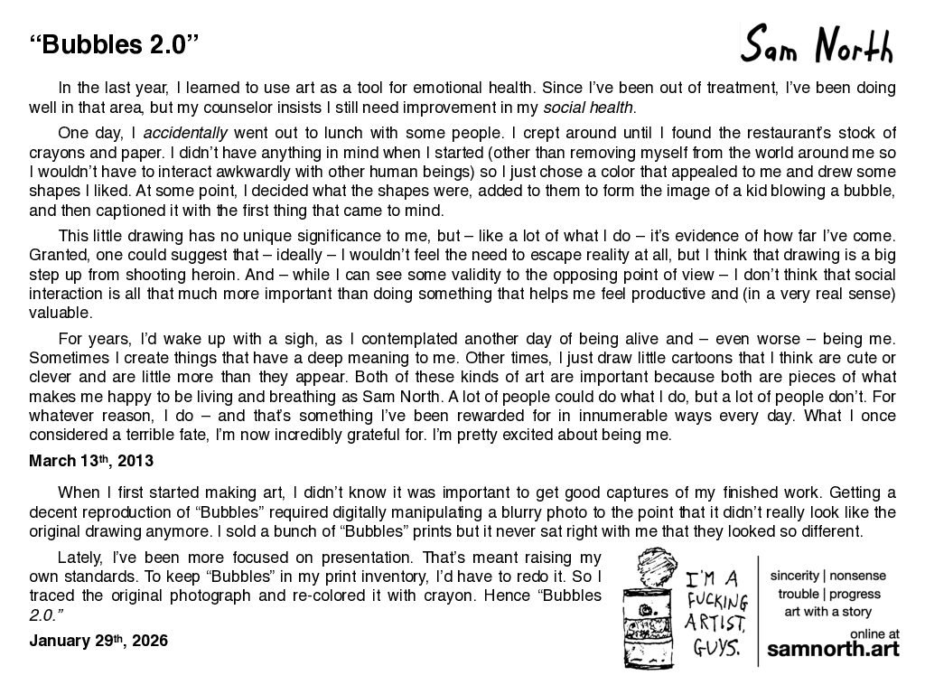 “Bubbles 2.0” was drawn by artist Sam North on 1/29/2026 in Durham, NC. The story behind it is featured in the blog.