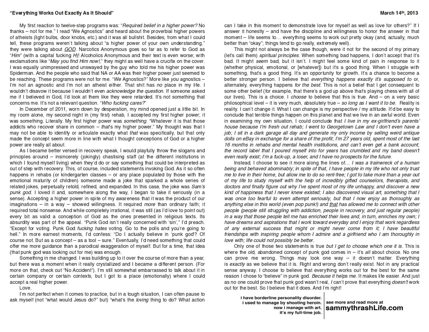 “Everything Works Out Exactly as It Should” was drawn by artist Sammy thrashLife in March 2013 in Bradenton, FL. The story behind it is featured on samnorth.art.