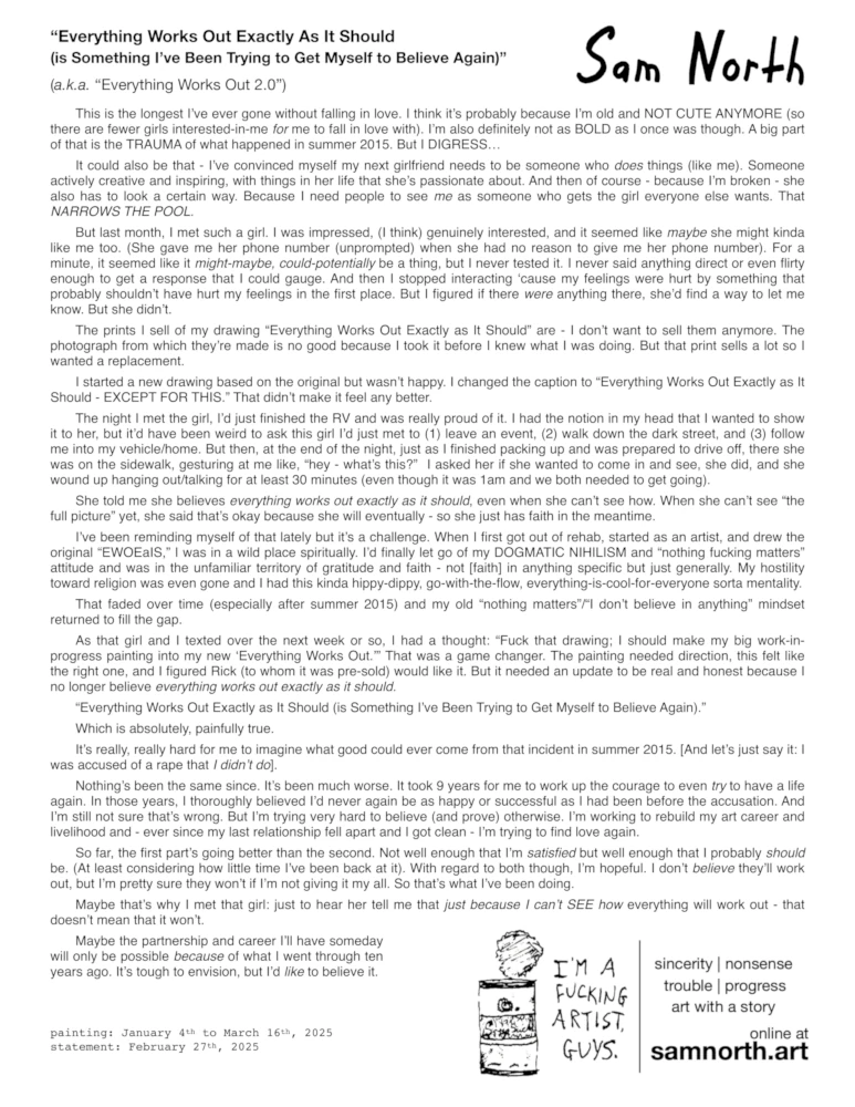 “Everything Works Out Exactly as It Should (is Something I’ve Been Trying to Get Myself to Believe Again)” is a 40×40-inch acrylic painting, created by artist Sam North in Tampa, Sarasota, Bradenton, and St Petersburg, FL from January to March 2025. The full story behind it is featured right here on samnorth.art.