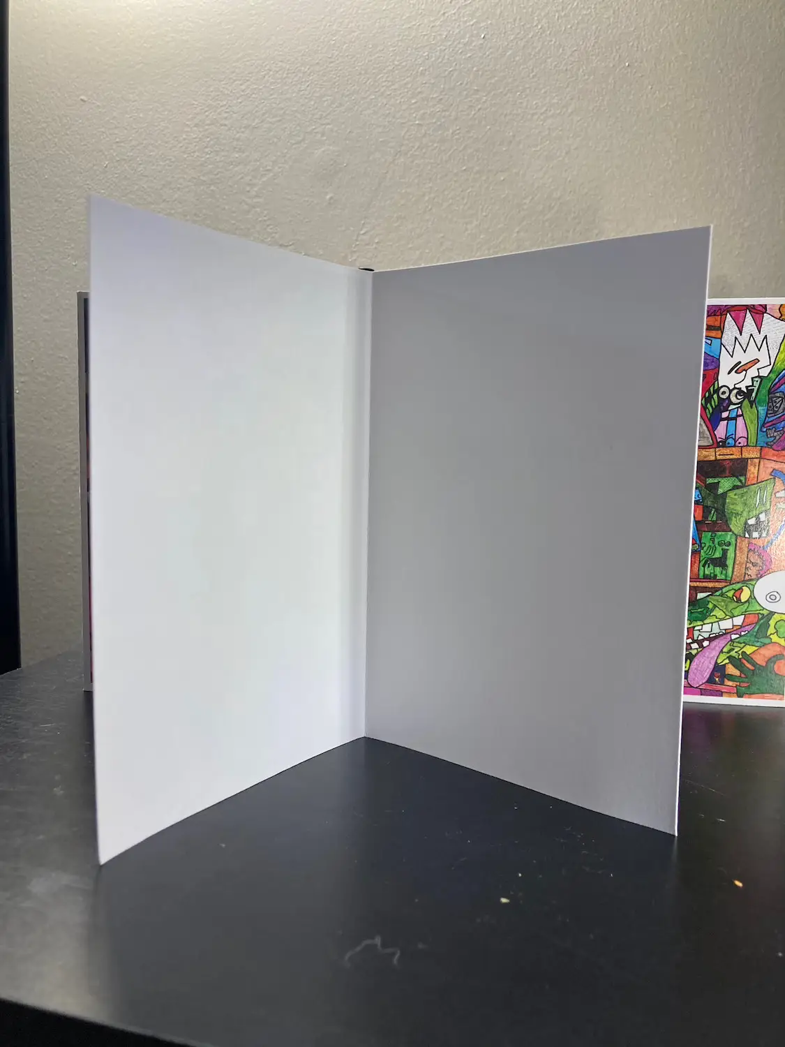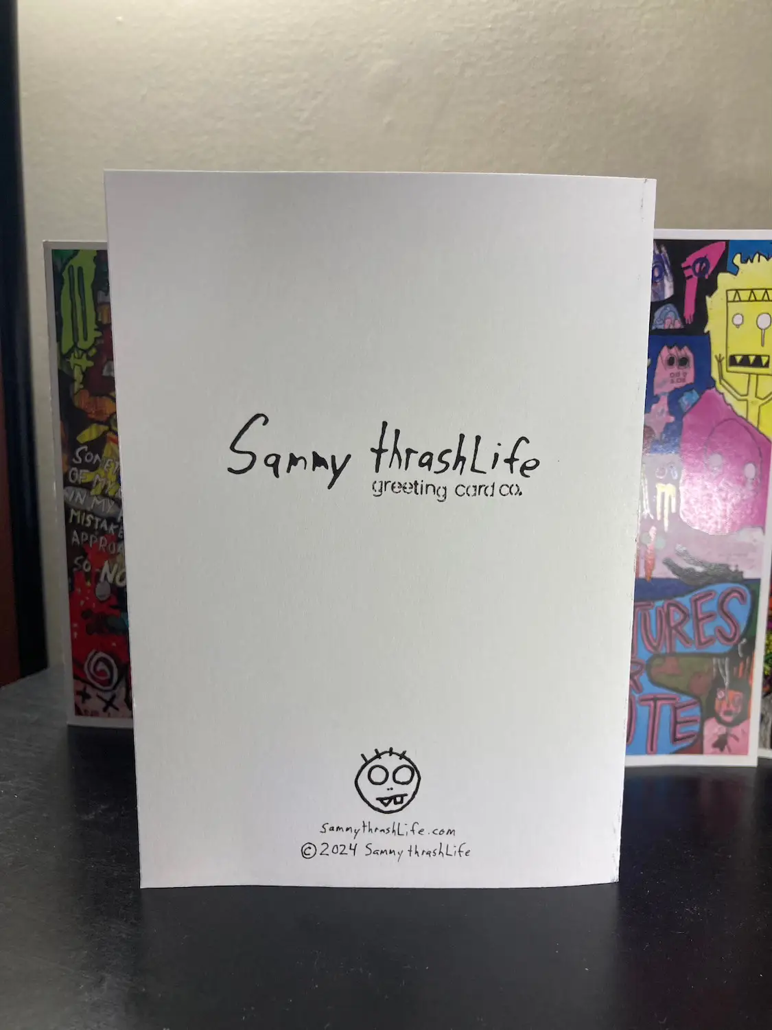 Each card measures 4×6″ (8×6″ when open) and comes with an appropriately sized envelope. Both inside pages are blank. The back of each card features a Sammy thrashLife Greeting Card Co. logo (because I think I’m funny), an insignia, and other minor details.