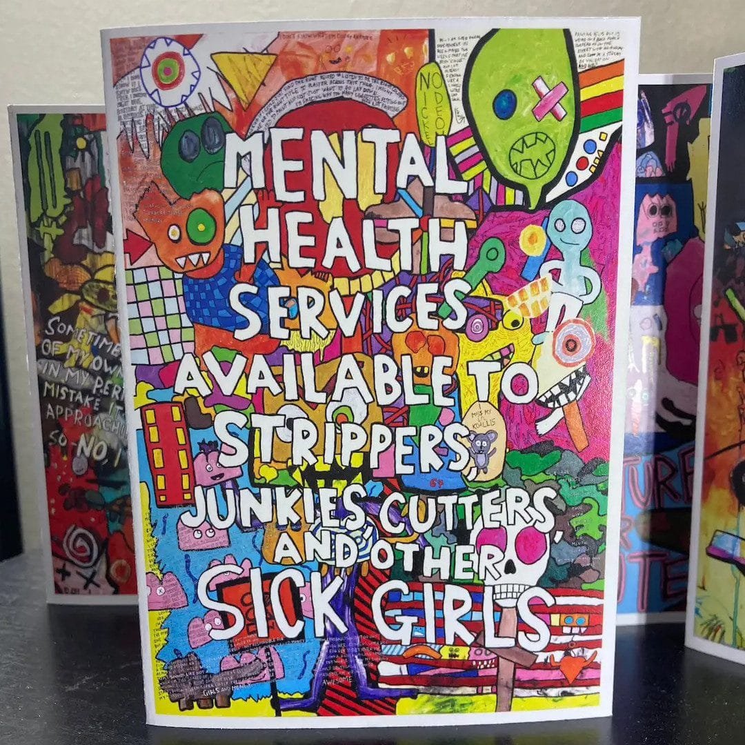 Every set (so far) includes “I Look Cool Doing It,” “Mental Health Services Available to Strippers, Junkies, Cutters, and Other SICK GIRLS,” “A Plume of My Own Cigarette Smoke,” “Still Sick,” and “The World Can Be Cold and Mean But I’m Gonna Try to Do My Best Anyway.” Cards that have rotated in or out include “Stay Punk,” “(We are All) Shitty Children,” “Maybe It’s Okay to Be Happy,” “Adventures Per Minute,” “Bright Side Nihilism,” and “Snowflakes Anonymous.” You can see each card in this listing’s image gallery or read about each painting in the linked blog entries.