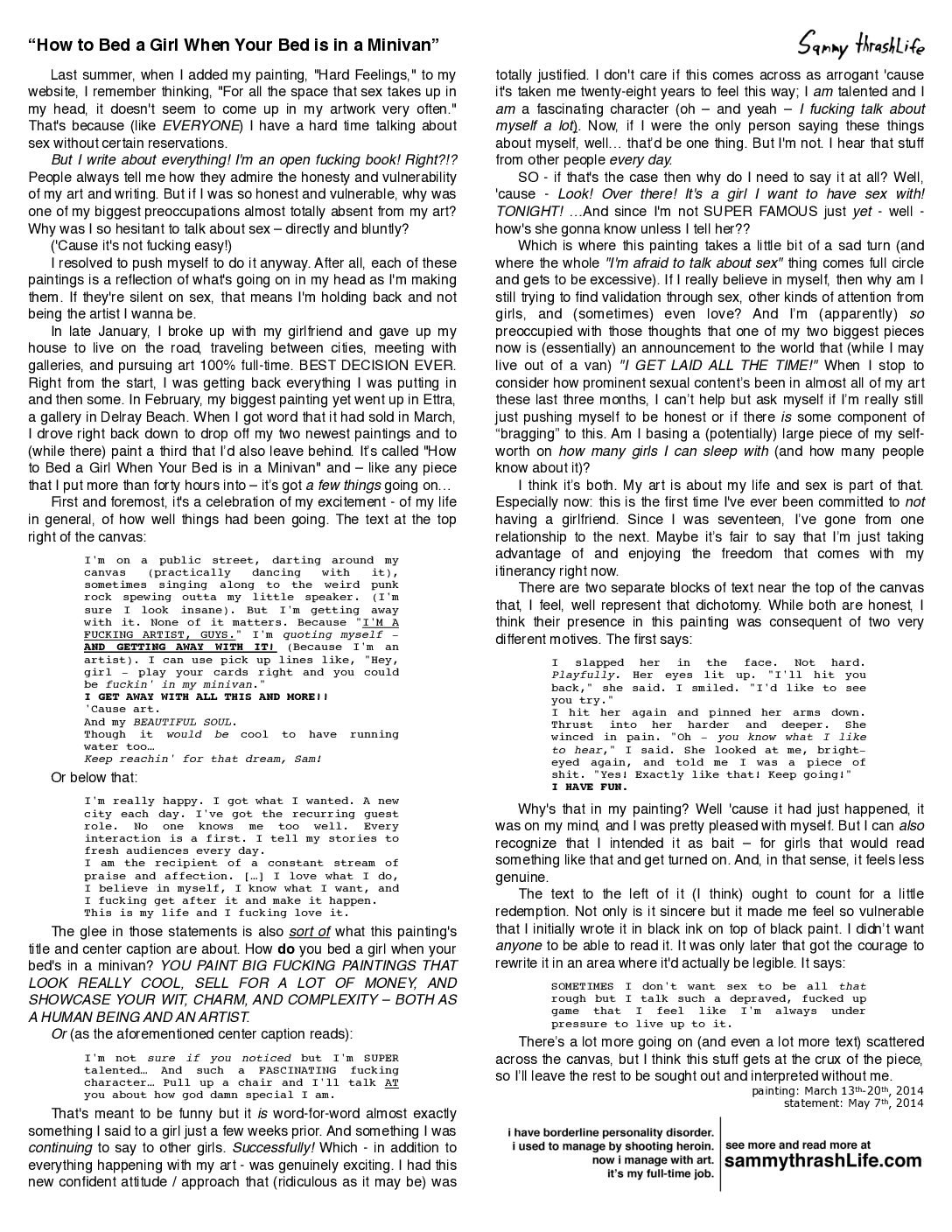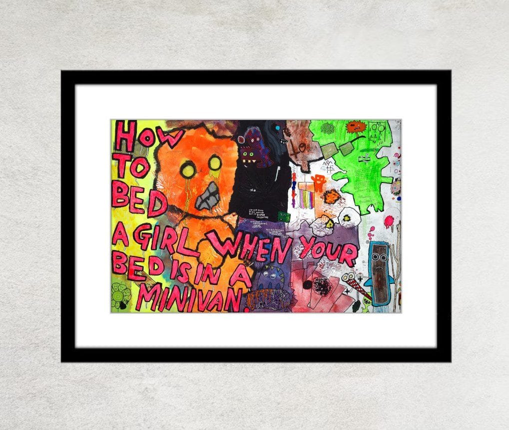 “How to Bed a Girl When Your Bed is in a Minivan” is a 60×40-inch acrylic painting, created by artist Sam North in March 2014, in Delray Beach, FL. It was originally featured in his blog entry for May 8th, 2014.