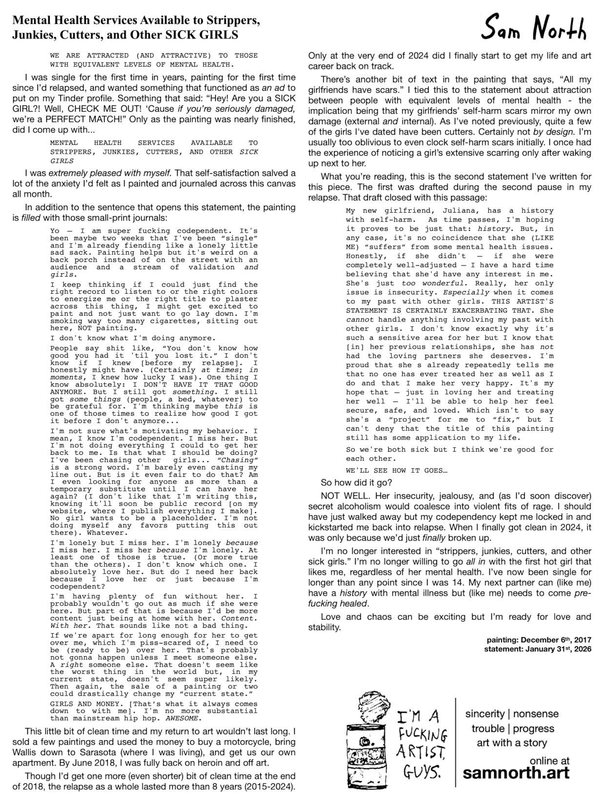 “Mental Health Services Available to Strippers, Junkies, Cutters, and Other SICK GIRLS” is a 3×4-foot acrylic painting, created by artist Sam North in December 2017 in Bradenton, FL. The full story behind it is featured right here on samnorth.art.