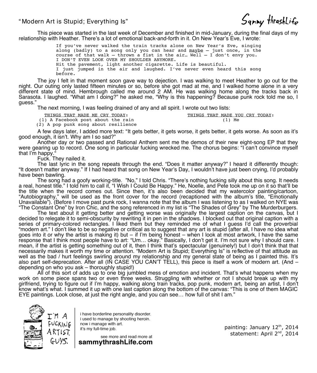 “Modern Art is Stupid; Everything Is” is a 60×40-inch acrylic painting, created by artist Sam North in January 2014, in Jacksonville, FL. It was originally featured in his blog entry for February 22, 2014.