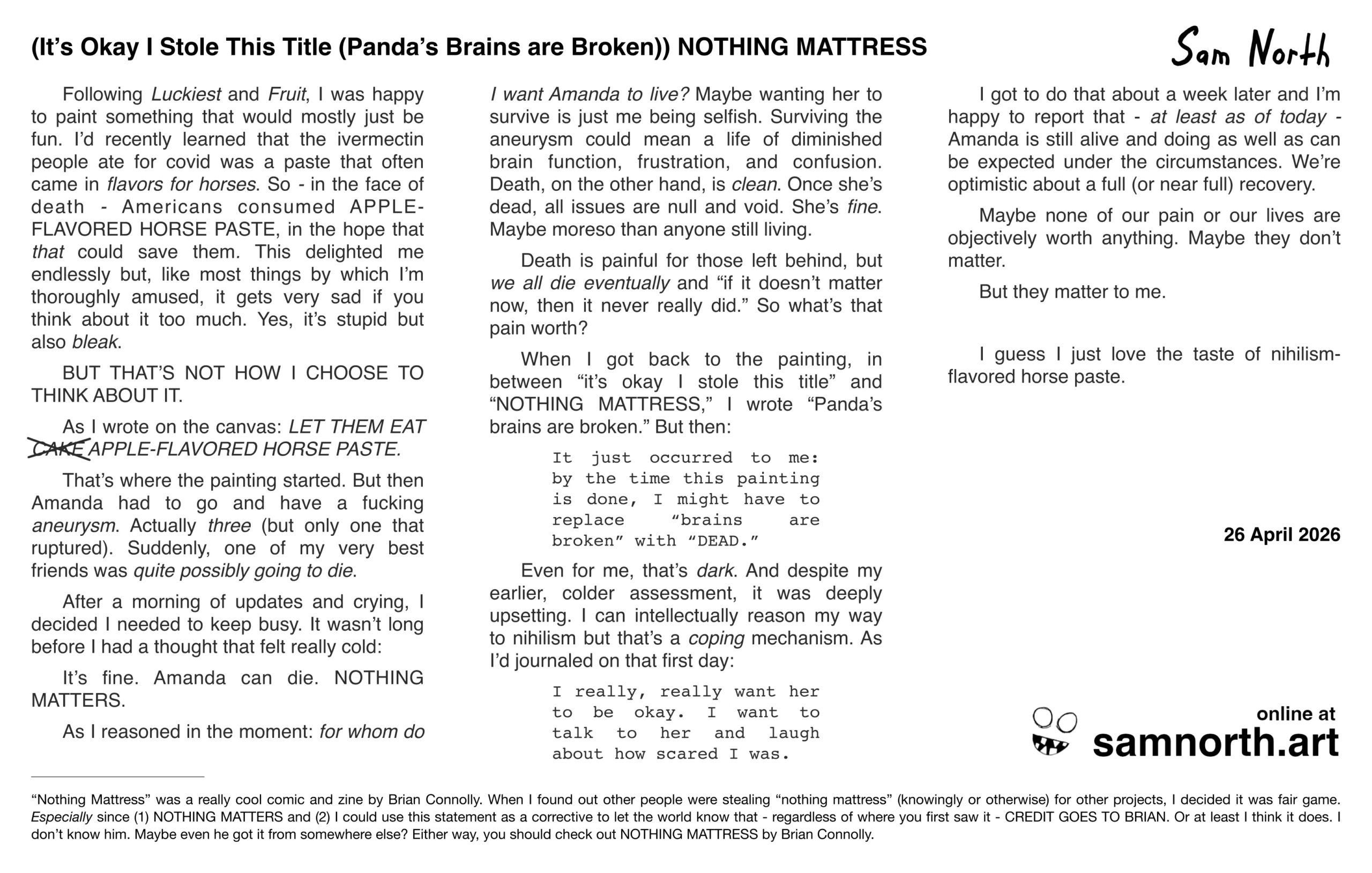 “NOTHING MATTRESS” is a 24×12-inch acrylic painting, created by artist Sam North in April 2026 in Atlanta and the Carolinas. The full story behind it is featured right here on samnorth.art.