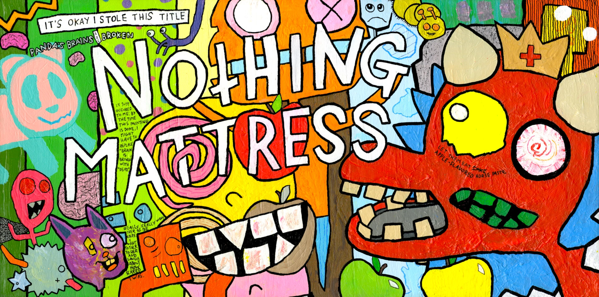 Bright colors, rotten smiles, and mischievous titles in bold block letters jump off the canvas, but it’s the hidden details and intensely personal small-print journals that sink their hooks in.