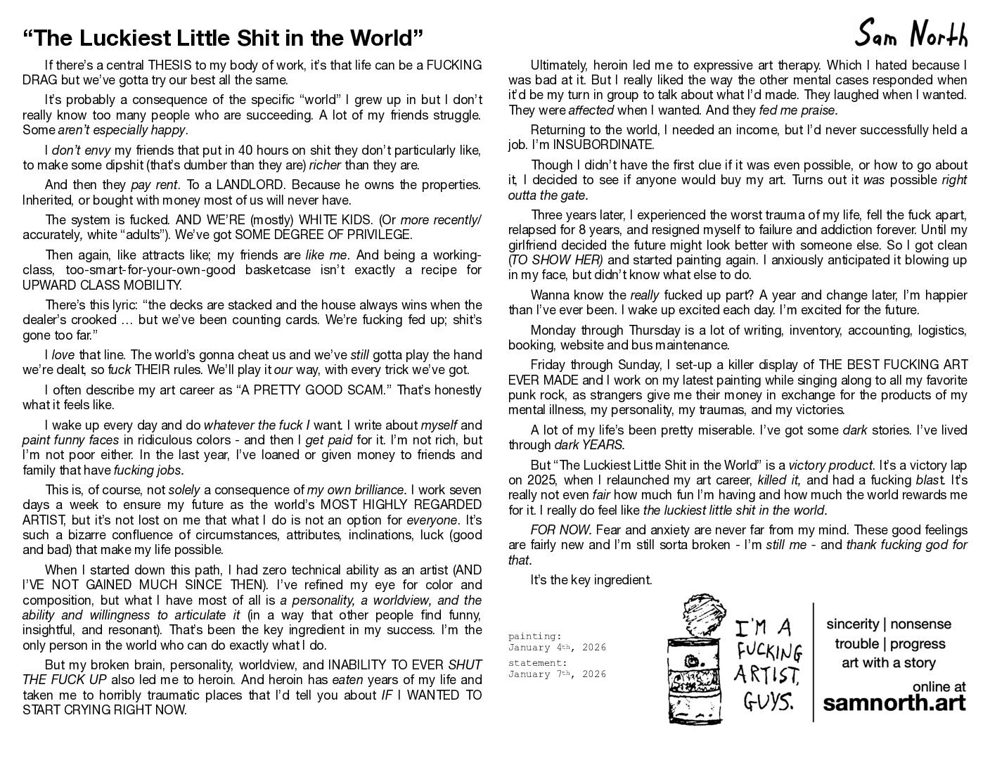 “The Luckiest Little Shit (in the World)” is a 40×30-inch acrylic painting, created by Sam North in 7 cities across South Carolina and Florida, between November 2025 and January 2026. Its statement/story is in this product listing’s image gallery and in the blog.