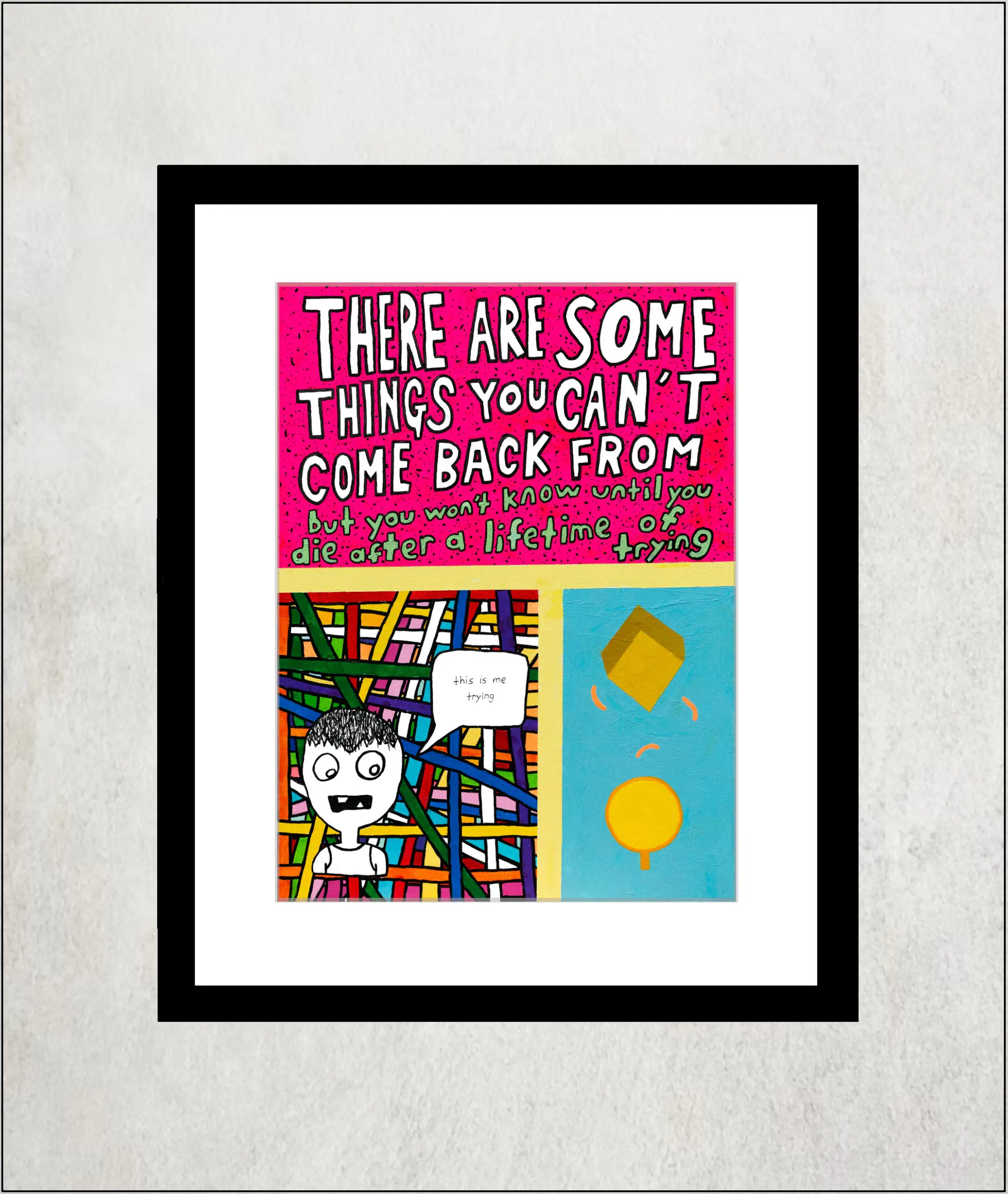 “Things You Can’t Come Back From” is an 18×24-inch painting, created by artist Sam North in March 2019 in Sarasota, FL. The full text reads, “THERE ARE SOME THINGS YOU CAN’T COME BACK FROM but you won’t know until you die after a lifetime of trying – this is me trying.”