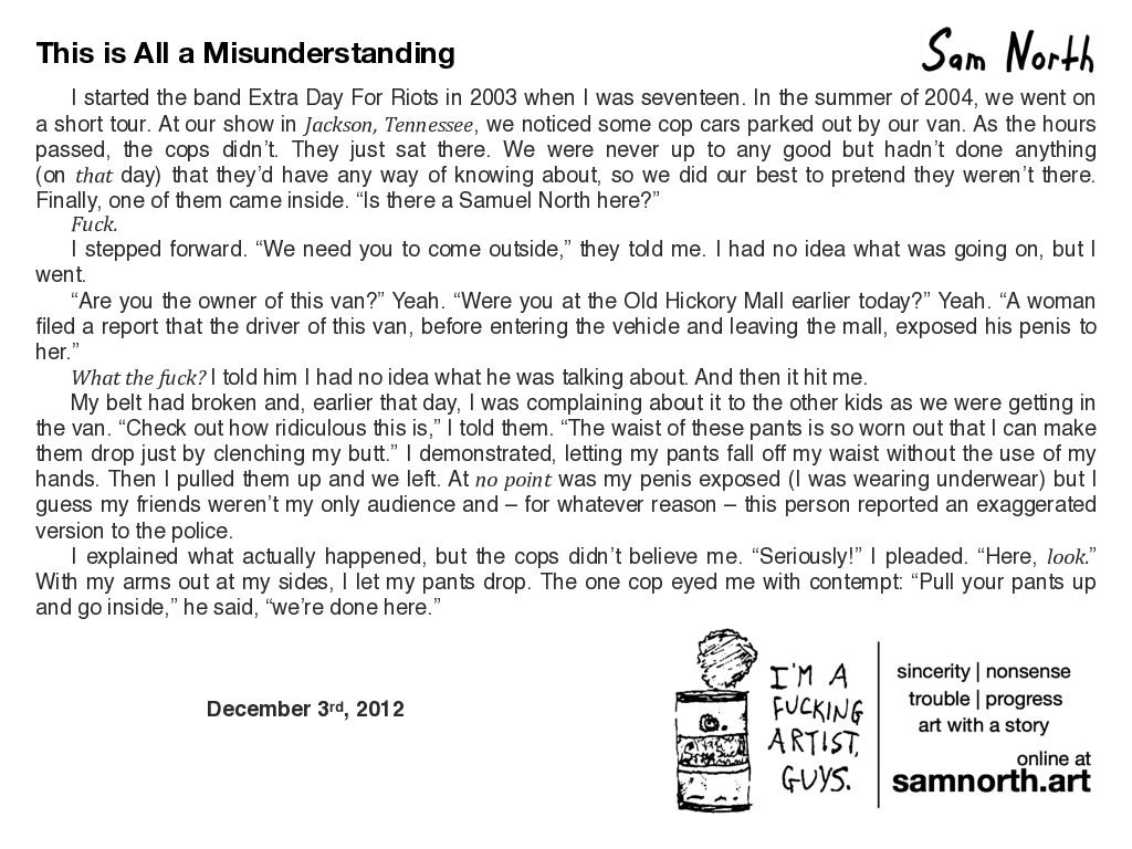 “This is All a Misunderstanding” is a 10×8-inch drawing, created by artist Sam North in November 2012 in Redington Beach, FL. The full story behind it is featured right here on samnorth.art.