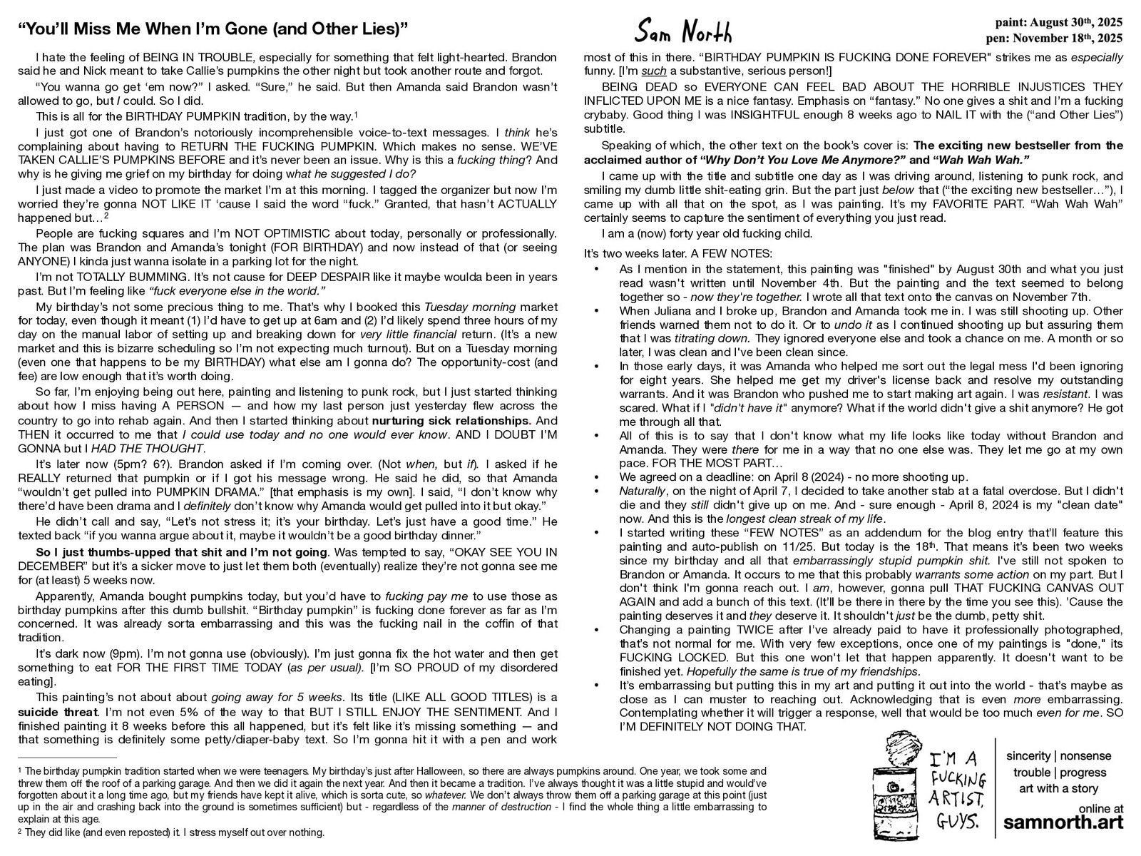 “You’ll Miss Me When I’m Gone (and Other Lies)” is a 48×36-inch acrylic painting, created by Sam North in the summer of 2025, while traveling through Florida, Georgia, and the Carolinas. The full story behind it can be found in the blog or in the image gallery of this product listing.
