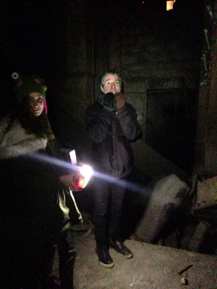 After playing tourists and eating Chicago deep dish pizza (something I never did while I was living in Chicago), we braved the winter night and headed out to the abandoned factory on the river to go exploring. The underground river in the basement was frozen but Wallis wouldn’t let me try to walk on it.